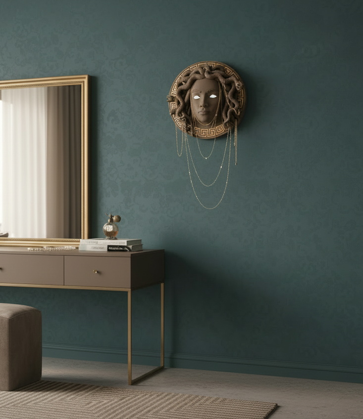 Medusa Duvar Dekoru & Işıklı Takı Tutucu – Mitolojik Sanat ve Fonksiyonelliğin Buluşması